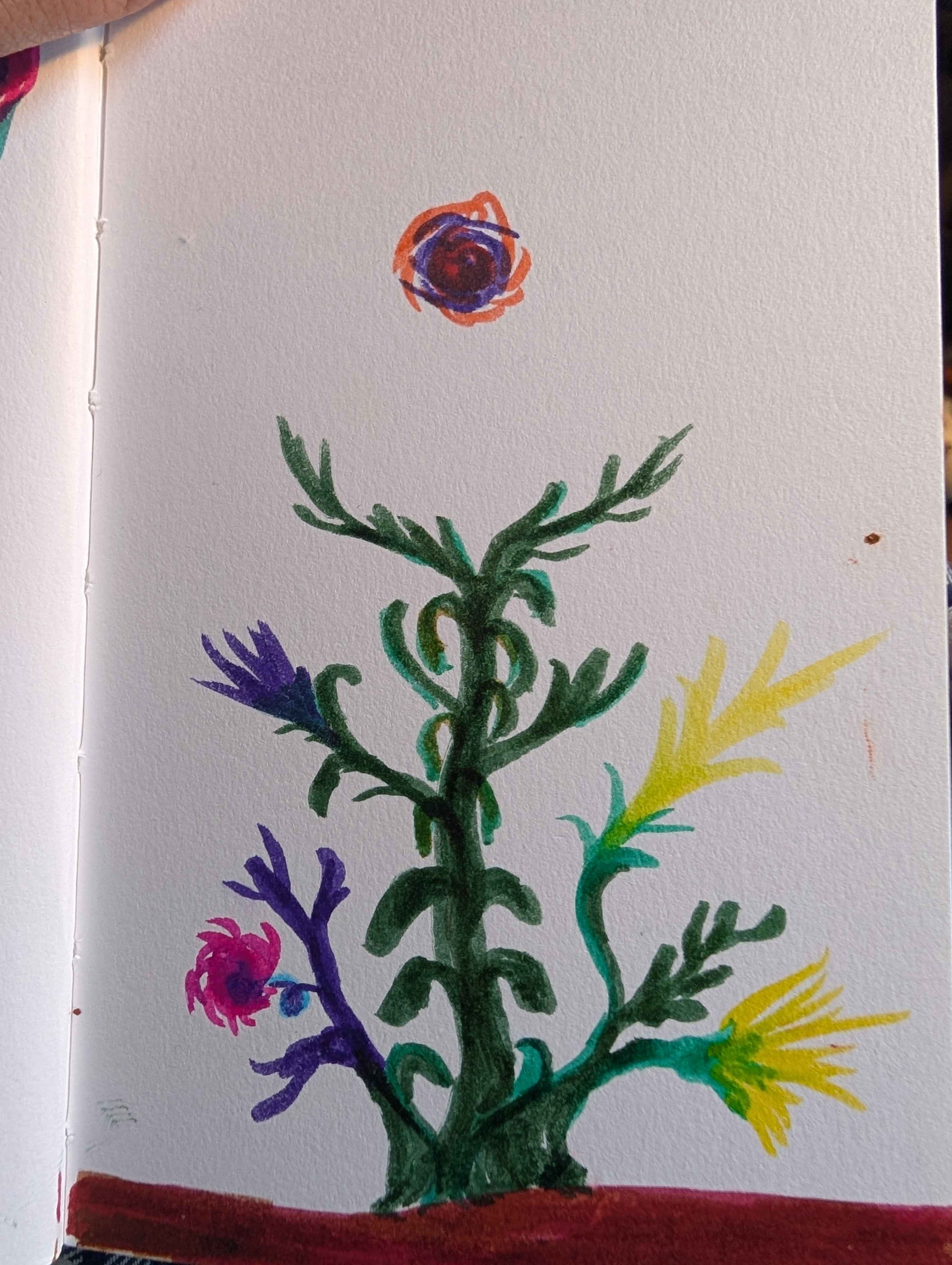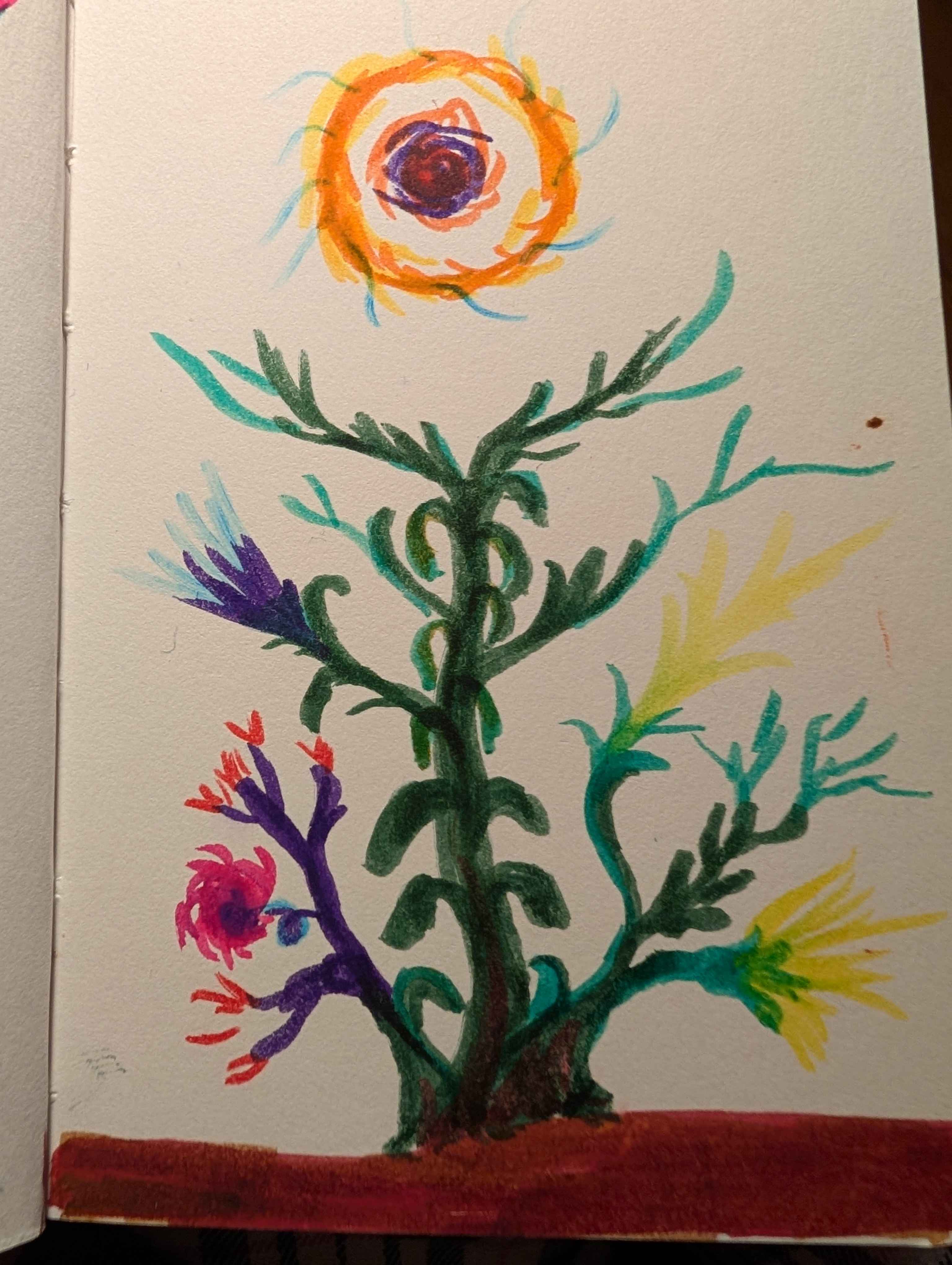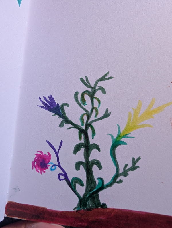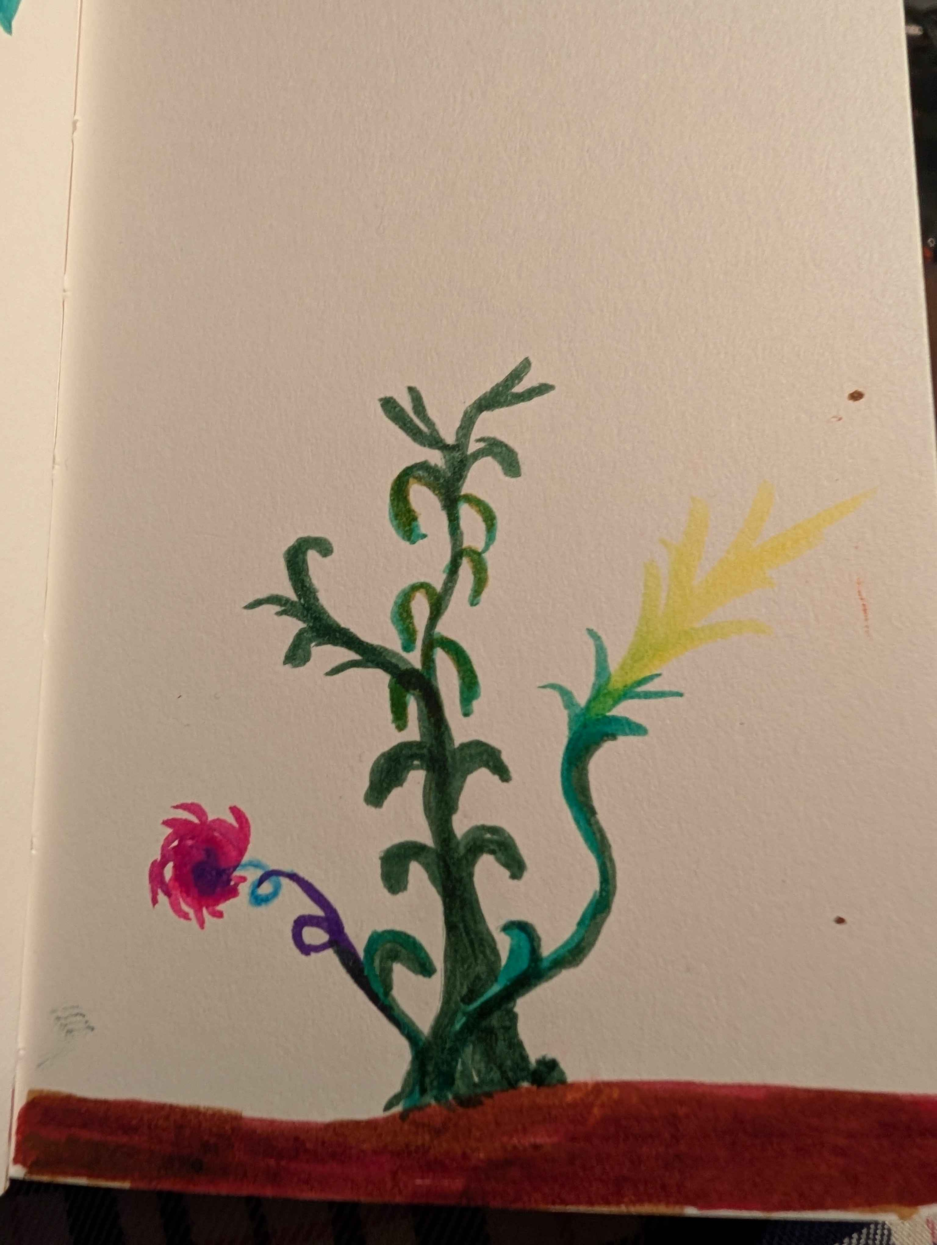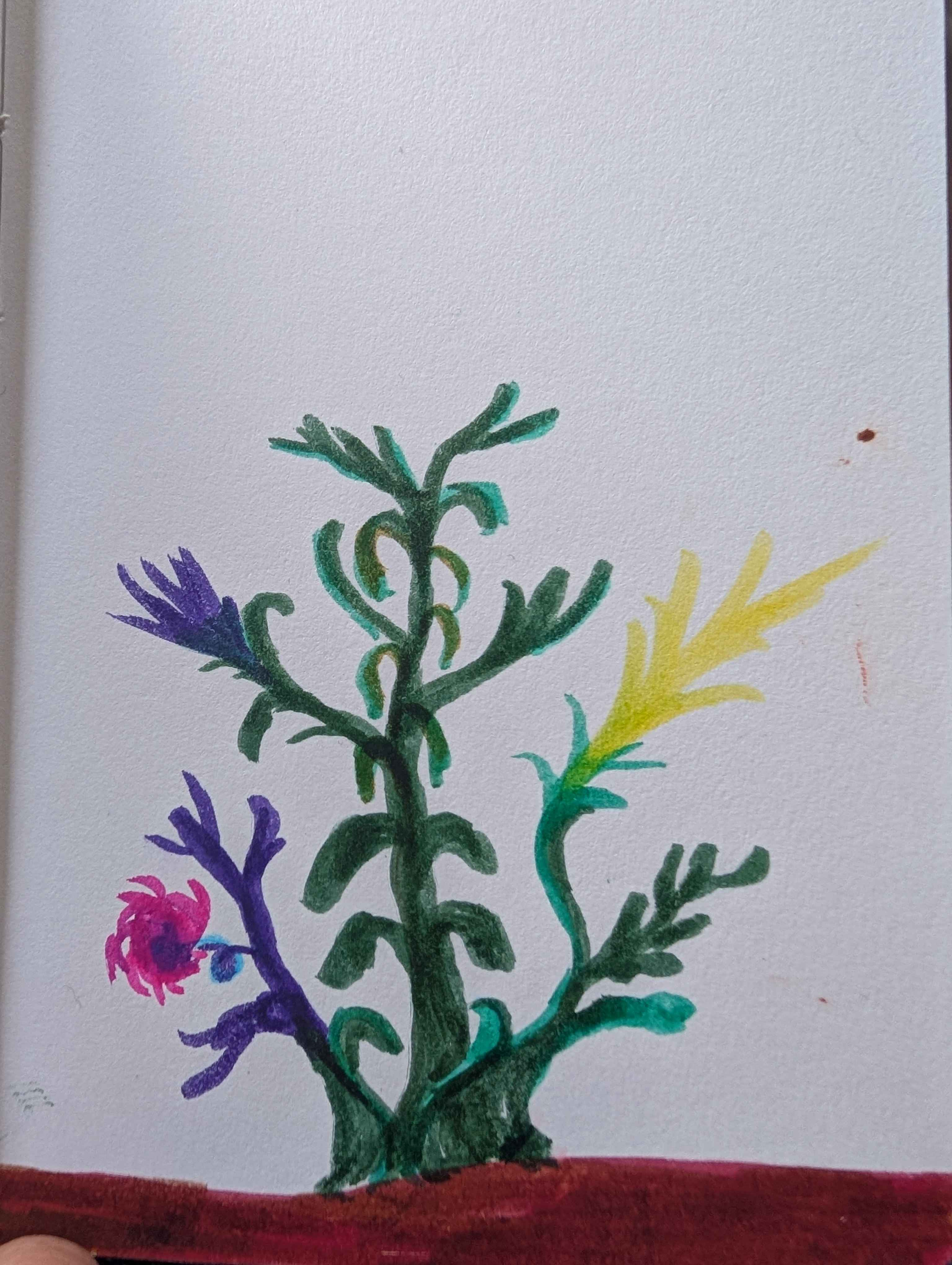 Alcyone: At first glance, the plant seems like it might simply be several plants grafted together, each plant from a different species. But as you look more closely you see that even down to the leaf every part is different, each leaf has a wildly different pattern of veins, and there is something slightly off about each one, as though created by someone who had heard a second-hand explanation of what a leaf looks like.