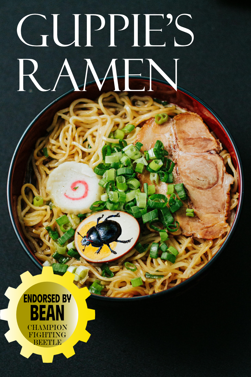 After Bean won the first beetle fight tournament, I made a poster endorsing Guppie's Ramen. I don't remember why.
