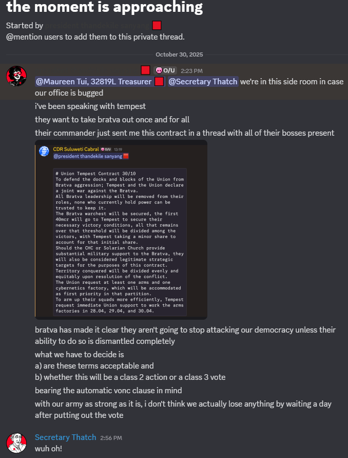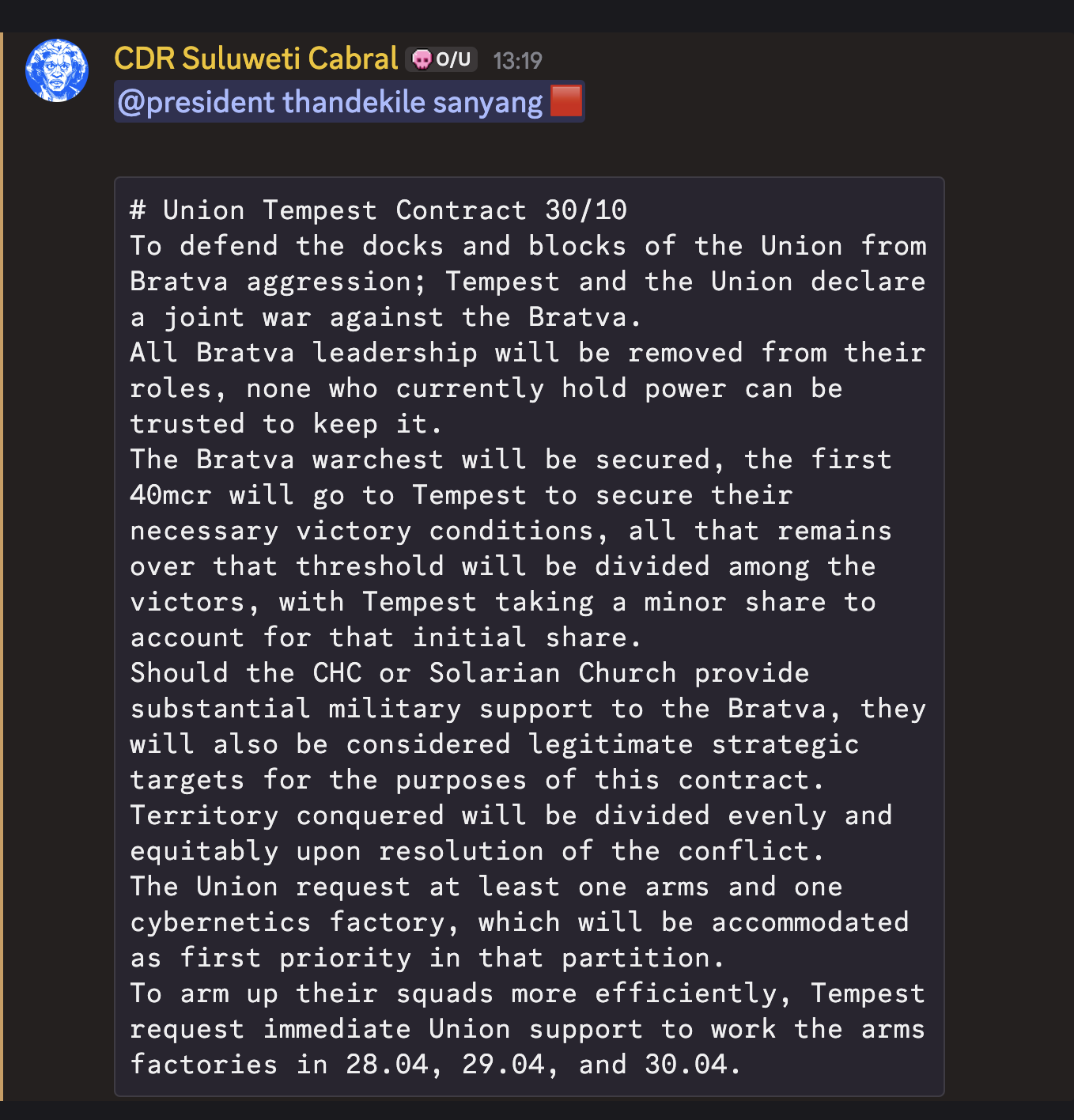 Thatch: Screenshots and a more official statement are still to come. But im telling you now. Today President Samsung sent us a contract from Tempest that would officially kick off war against the Bratva, and if it was needed, CHC + the church too. I pulled her aside to talk it out. Or yell at her, idk. She tried to “lock in” a station-wide safehouse sweep with our 10 new squads. I tried to stop her, we both called HQ security. My squad got there faster, she didn’t stand down, and…. yeah.
