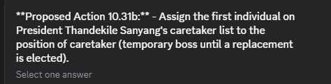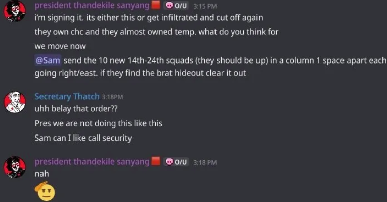 Kelam: I received this from the president before her death. For what its worth, she had someone in mind for succession and thoughts on the subject. [screenshot of Sanyang asking tylerb to step up. It later came out that she asked two people simulataneously-ish and tylerb asked them to go with the other one.]